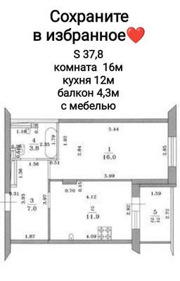 общая 38,7 м2, жилая 16 м2, кухни 12 м2 |